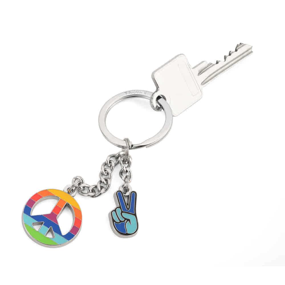 Small Peace anahtarlık, barışı ve dayanışmayı simgeleyen barış işareti ve V-sign (zafer/peace konfigurasyonu) figürleriyle tasarlanmış anlamlı bir aksesuardır. Gökkuşağı renkleriyle renklendirilmiş charm’leri ve parlak krom kaplamalı metal yapısı ile hem göz alıcı hem dayanıklı bir yapıya sahiptir. Kompakt ve hafif yapısı sayesinde anahtarlarla birlikte günlük kullanımda rahatça taşınabilir; barışı savunan ve mesajını taşımak isteyen kullanıcılar için ideal. Hediye paketiyle birlikte hediye olarak da uygundur.